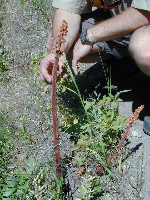 This is some kind of parasitic plant. Notice the complete lack of leaves, or anything green. Usually this type of plant lives off the roots of other plants. The stalk was somewhat sticky.