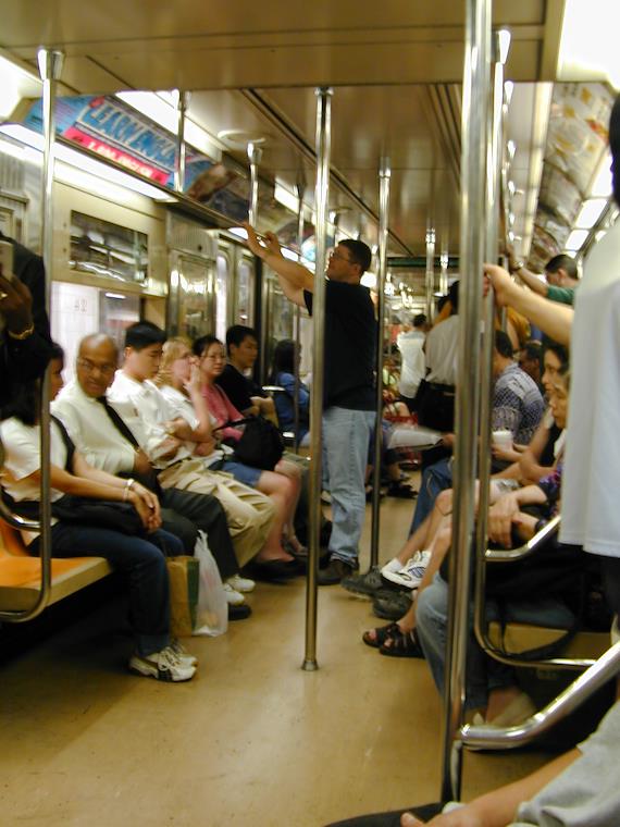 Monday was our ethnic neighborhood walking tour day. We started out taking the subway to Chinatown. This is a surreptitious subway shot--the camera we had allows you to take a picture without actually holding the camera up to your eye, by looking down at the LCD screen.