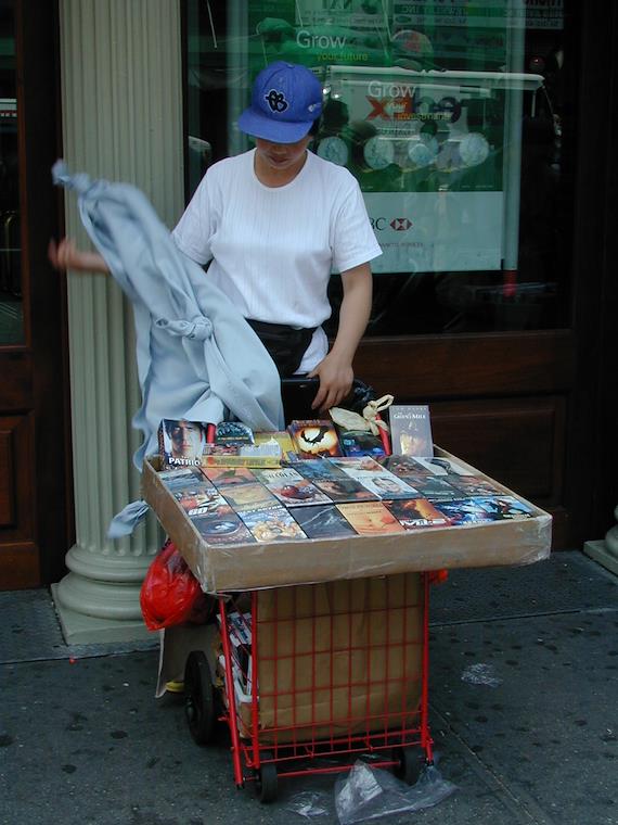 There were also people selling fake DVDs. Eric has watched a DVD bought from one of these vendors, and apparently they're very low quality. Notice her stand--on wheels so she can quickly move away in case the police come.