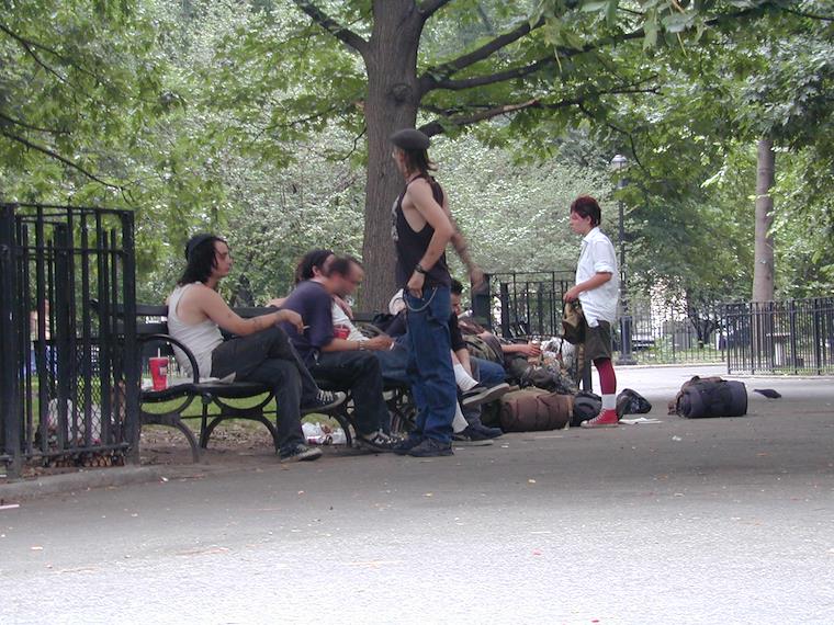 We took a walk to Alphabet City/Thompkin park, because I wanted to see a rougher neighborhood. Eric surreptitiously took these pictures of a big group of young anarchist/punks that were all congregated in one area.