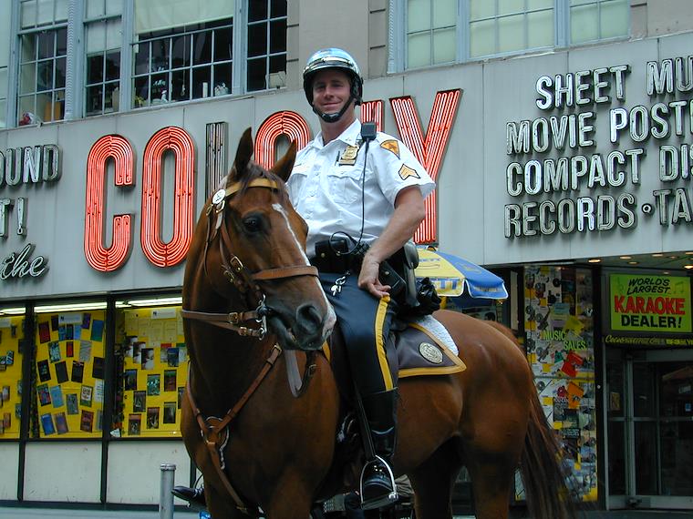 There were still tons of vendors selling all kinds of counterfeit goods. Oakley sunglasses were very popular, all sold by very dark-skinned Africans. They had the sunglasses in large garbage bags with the sides rolled down neatly, and would pack up and move as soon as they saw police in the area. We actually saw this happen. The cop below was posing for us...
