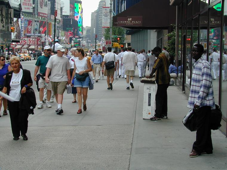 ...and later walked up the street where the counterfeit goods vendors were. They packed up immediately, but as you can see below, were selling again seconds after he left. You can still see the cop in this picture (horseback on the street, with the light blue helmet) and the black vendor on the right side is just about to put his bag of sunglasses down again.