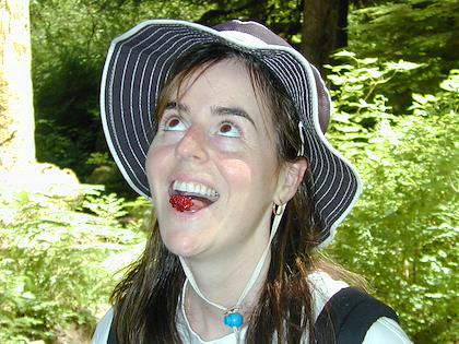 |  | |  | | A closeup each of us. That funny thing on my tongue is a salmonberry. They come in two varieties, one pink colored (like salmon flesh) and the other a dark red (like the one on my tongue). They're not that flavorful, but they are plentiful in the woods. | |