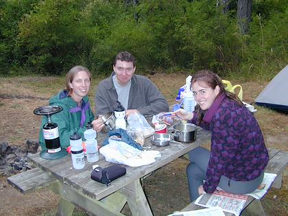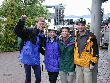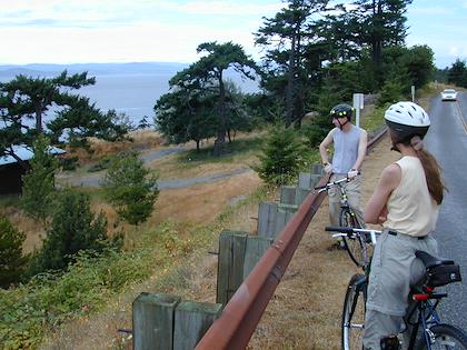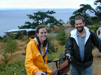 | Here's Hans, Holly, Angela, and Eric (Bultemeier) at the start of the trip in Friday harbor. After 3 weeks of bright sunshine, the 22nd dawned rainy and cool. | | Angela and Eric take a look at the view on the road towards Limekiln State Park. |