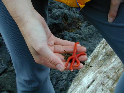 | We went looking around in the tidepools at Limekiln, and found this unusual starfish, with skinny red arms. | | The park contained numerous madrona trees. The outer bark of these trees peels away, and leaves a very smooth reddish inner back |
