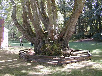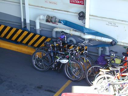 |  | |  | | This is a huge broadleaf maple tree on the grounds. Very impressive. | | All too soon, we were headed back. It was completely sunny by now. Below are our bikes on the ferry. With bikes, there's no wait whatsoever to get on the ferry. With a car, though, you could wait for hours. |