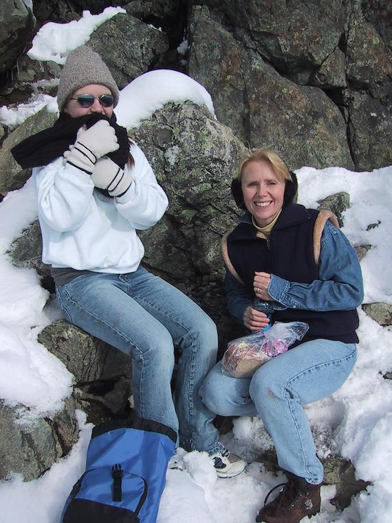 Jean and Kelly freezing on top of Mt. Si, about to eat lunch.