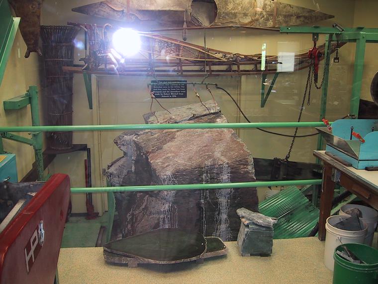 In Girdwood, there was a jade shop. This one boulder of jade is being processed. You can see the saw cutting through it.