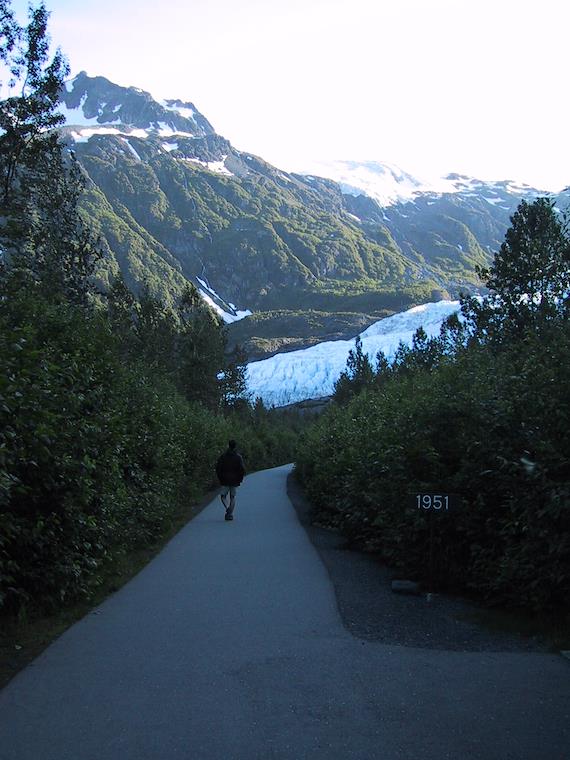 The glacier has been receding the past couple hundred years. The park service put up signs marking where the glacier was at a particular year, so you can see how it receded.