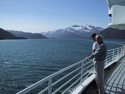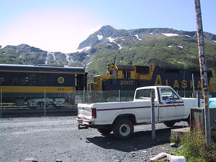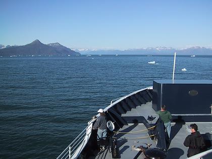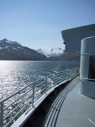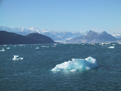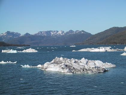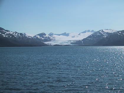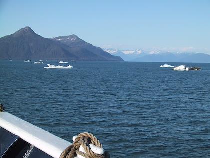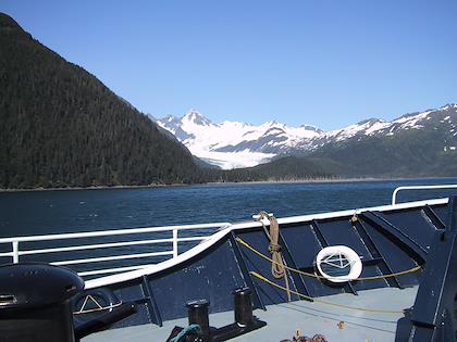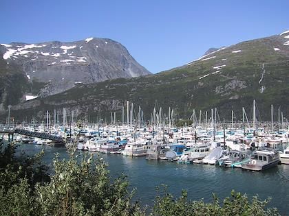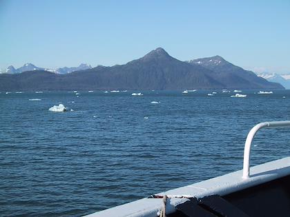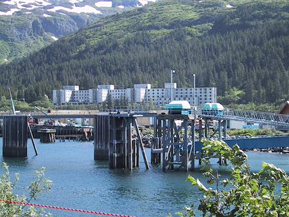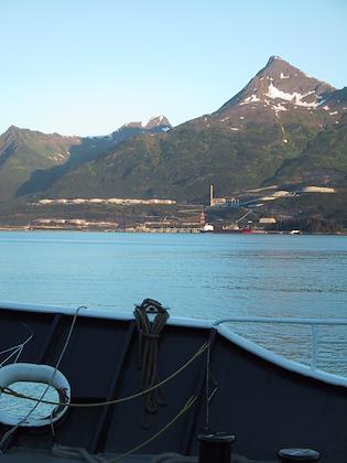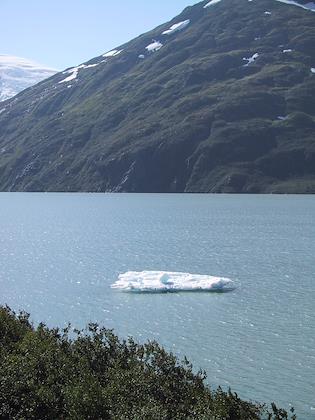| On the 9th we drove from Seward to Whittier, and then took the ferry from Whittier to Valdez. You have to take a tunnel from Portage Lake to Whittier, which up until a couple months ago was only open to trains. At Portage Lake, we saw our first iceberg (actually, I don't think they're called icebergs when they're this small). Later on the same day, we saw many, many more. | | This is the town of Whittier. We had some time to kill before taking the ferry to Valdez, so we walked around. It was super windy, but a very beautiful day. Highly unusual this time of year. |
