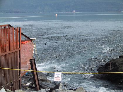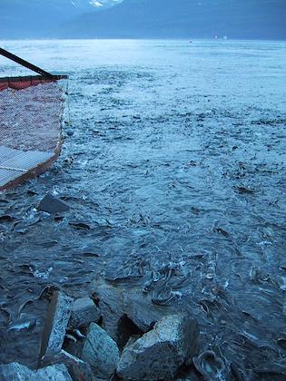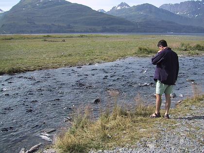 | On the 10th we explored the Valdez area. When we were there, there were tons of salmon and, of course, the salmon fisherman weren't far behind. This is from a salmon viewing area just outside of town. | | On the other side of the bay from the town of Valdez is the pipeline terminal, and also a salmon hatchery. The sea was alive with fish. |