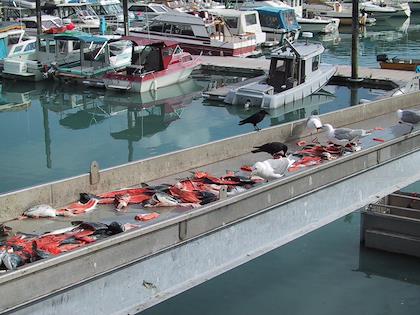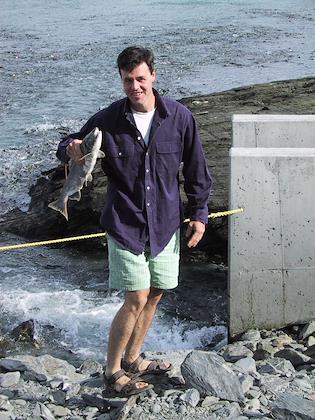 |  | |  | | Later on we walked around the harbor. We saw this fishing boat rolling up it's nets. | | There's a "clean your own salmon" area right outside the harbor. It was a treat to see people fillet the salmon quickly and skillfully, with extremely sharp knives that they sharpened every couple minutes. This gentlemen is from Fairbanks, but is planning on retiring in (guess where?) Seattle, and wintering in Arizona. |