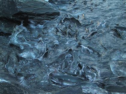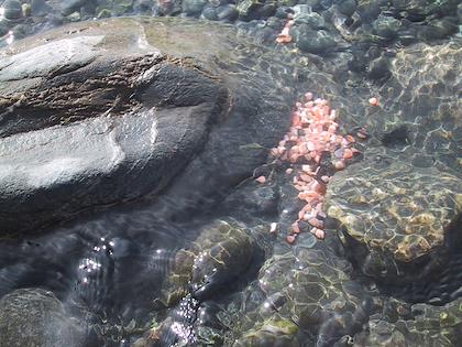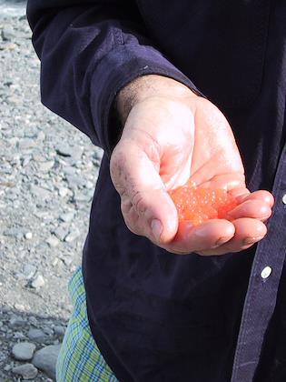 | They were very easy to catch, even with bare hands. Tom let it go after he caught it, though. | | Tom picked up a handful of salmon eggs from the water. |