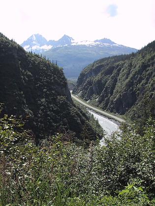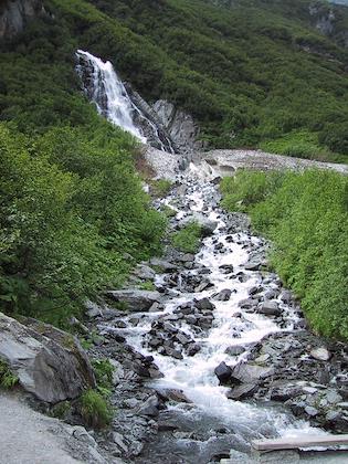 |  | |  | | Horsetail falls, outside of town on the Valdez highway. | | Tom and I took a hike up Goat Trail, which was an old gold mining route over the glacier. It wasn't build for the views--this is pretty much the only decent view we had. |