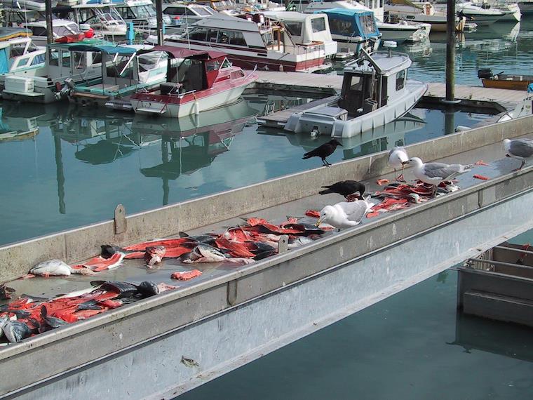 Much of the fish is wasted when you cut fillets off a salmon. The waste was thrown off a ramp into a cage in the water. I wondered what happened to it afterwards.