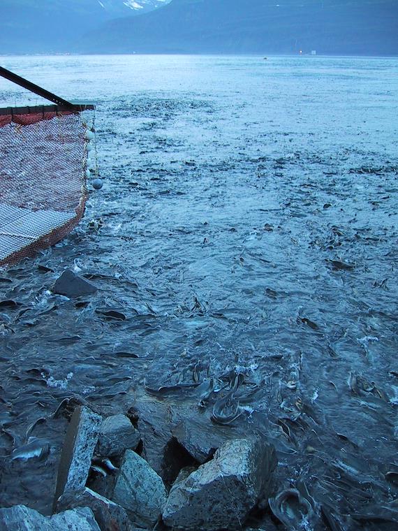 Later on in the evening, we drove to the salmon hatchery area we'd gone to in the morning, because we'd been told that in the evening the bears come out. Didn't see any bears, but there were many more salmon, even though it was hard to believe.