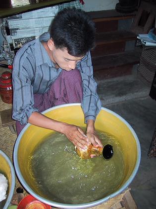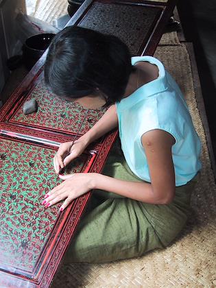 | In a lacquerware shop. Most of the lacquerware is exported to Thailand, for sale to tourists there. | | Some lacquerware has gold leaf put on it, in a pattern. The finishing step is to wash the gold leaf off that doesn't belong in the pattern. The water that it's washed in is saved and sold to people who get the bits of gold leaf out of it again. |