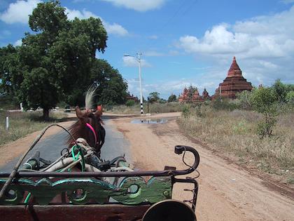 | Thousands of years ago, Bagan was a religious center. There are thousands of ruined temples there, in various stages of disrepair. | | I rented a horse cart for a day of touring around. |