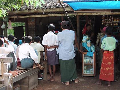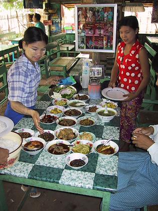 | Lunch at a Burmese style buffet. At first I was amazed at the waste, because we ate less than one tenth of this. But my guide told me that whatever we didn't eat went right back into the pot. The women working here were very chatty and open--it turned out that they were part of a group that sang at wedding receptions and other celebrations. | | Watching a movie on a VCR. |