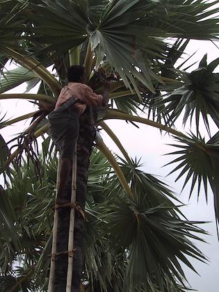 |  | |  | | Sugar palms are cultivated in this area. We stopped at the hut of one of the workers and watched the palm sugar sap being boiled down. I bought a little woven basked of palm sugar candy (basically, just the boiled down sap) for about 25 cents. | | To harvest the sap, they cut slits in the palm sugar flower and put bowls beneath the slits. The sap runs into the bowls. |