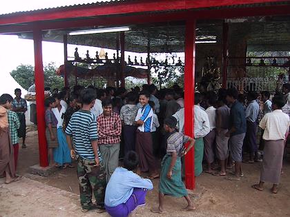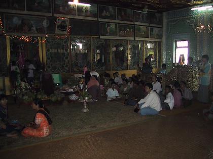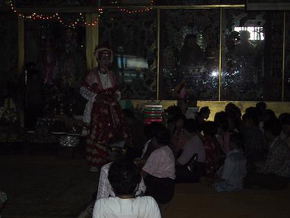 |  | |  | | As part of a religious ceremony, money was thrown into the crowd. It's just about to happen in this picture, that's why there's so many men hanging around. | | This picture is a little dark, but the person in the red dress is a man dressed as a woman. Apparently the nat spirits will take possession of a person only if it is a man dressed as a woman, or a woman. |