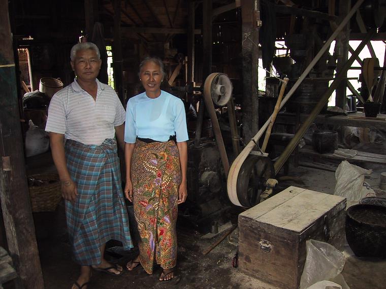 An oil mill, with the owners. They pressed oil out of peanuts and seasame seeds.