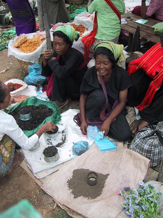 Pao tribeswoman, in their traditional black costume. Here they're selling pickled tea and sesame seeds.