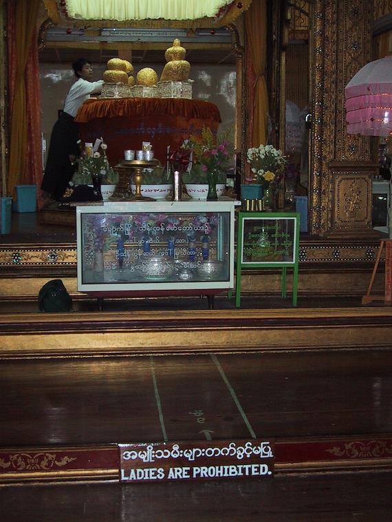 The round gold things in the picture are Buddha images. They've had so much gold leaf plastered on them that they look like shapeless blobs. Notice the "ladies are prohibited" sign at the bottom.