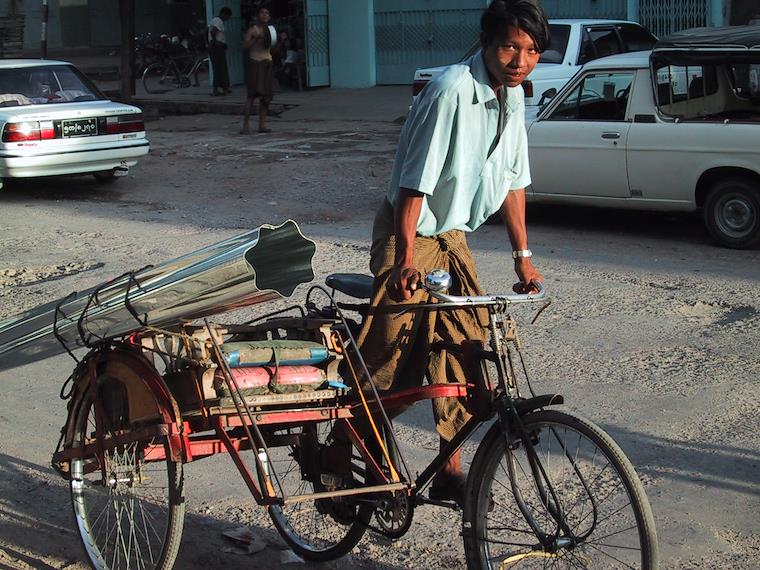 Trishaws normally transport people, but this kid is transporting some corrugated metal.
