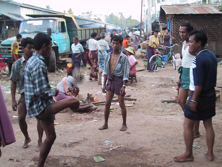 This game is a lot like hackey sack, except it's played with a large wicker ball. You can't see it in the picture, it's a blur.