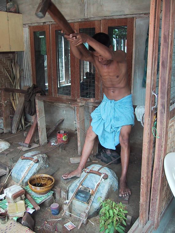 On our way to the airport, we stopped at some workshops. In this one, gold leaf was being produced. This man is pounding a leather booklet containing a piece of gold leaf in each page.