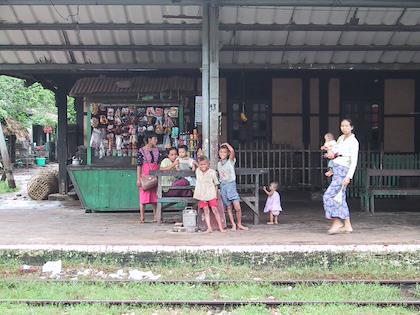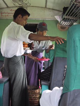 | Some kids waving to me as I passed through a train station on the Yangon-Thazi train. I was a real oddity there as a foreigner, and some people pointed at me and stared. | | Water vendor, selling to passengers. The vendors would run up as soon as the train slowed down, and try to sell things to people on the train. |