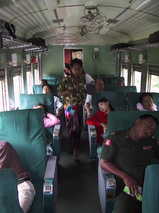 | Selling roasted chicken to passengers. One guy carried the chicken, the other carried the rice. As soon as you showed even a flicker of interest, they were all over you. It seemed really unsanitary, though, and I didn't try any. | | My compartment. Notice the military officer on the right. |