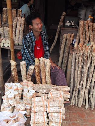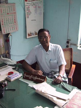 | Thanaka for sale at a market. | | Soe's father, at his office. He's the local manager of a bank. |
