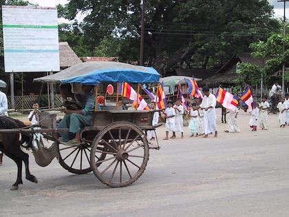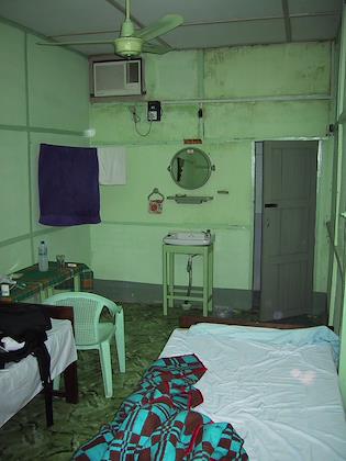 | My room. It had air-conditioning, but the electricity was so unreliable that I used the fan instead. | | A Buddhist procession outside the hotel. They were asking for donations for the local temple. |