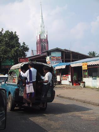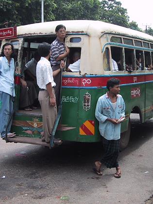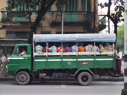 | Notice that the numbering system on this bus is not the standard Arabic numerals that we're used to, but rather the Burmese numbering system. It made it very difficult to catch buses, read prices, etc. | | A pickup, with seats inside, is also used as a bus.. |