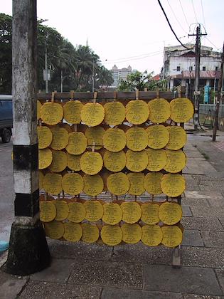 | This is a typical bus in Yangon, except it's usually a lot more crowded. Often men are hanging 2 or 3 deep off the back. | | These fans have Buddhist doctrine written on them. |