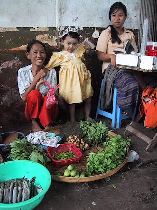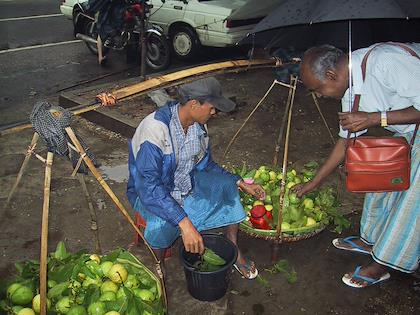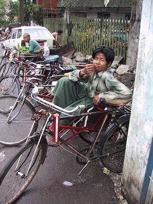 | More sidewalk vendors. | | This trishaw boy hangs out at the entrance to a food market, hoping someone will hire him to take them home with their purchases. |