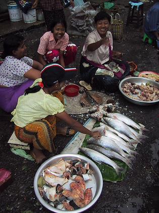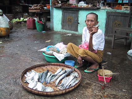 | These are some of the many street vendors you can see everywhere in Yangon. This woman is selling vegetables for curry. | | Fish for sale on the street. Notice this old woman smoking a cheroot, or Burmese cigar. You can also see the scale she used to weigh her fish in the red plastic basket. |