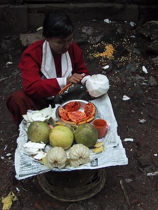 | Peeled and spiced (with chili, I believe) pomelo for sale. A pomelo is like a very large grapefruit, but a little less tart. | | Selling a glutinous rice/coconut snack on the street. |