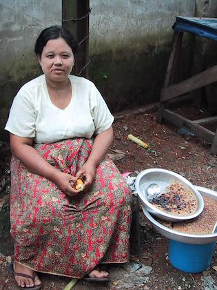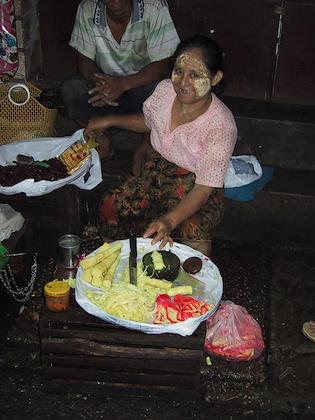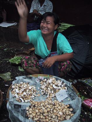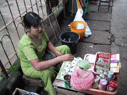 | These were a treat! Lotus flower seeds. I bought a small package for 50 kyat (about 12 cents). The seed is about the size of a blueberry, and you pop the husk off, and eat the inside. Very tasty! | | Frying and selling eggs on the street. |