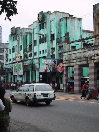 | These boys are playing a game very much like the Italian Boccia. They threw a large stone out, then tried to throw smaller stones as close to it as possible. They were betting--you can see the folded up bills in their hands. I threw one, and did pretty well. | | A movie theatre, looks like it was build in the 20's. I think it's an Indian movie, there were a lot of those playing. A substantial minority of Burmese have an Indian heritage, and speak Hindi. |