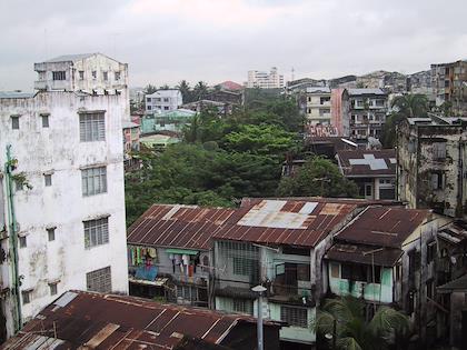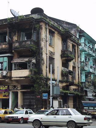 | There's so much rain in Yangon! Some buildings were covered with moss and weeds growing out of cracks in the buildings. | | Government-sponsored billboards like this were posted in all major cities. This has "dictatorship" written all over it. |