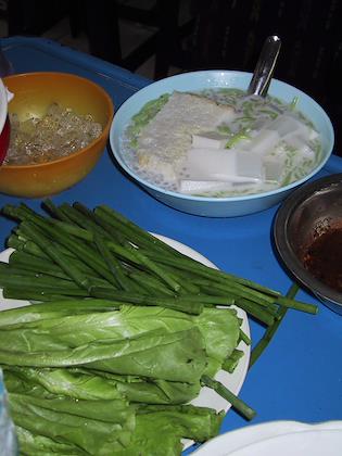 | This is part of our lunch. You dip greens in some hot sauce. The bowl with a spoon is a desert, with coconut jelly and some other stuff. Tasty. | | Pomegranates. I bought some, but didn't like them very much. |