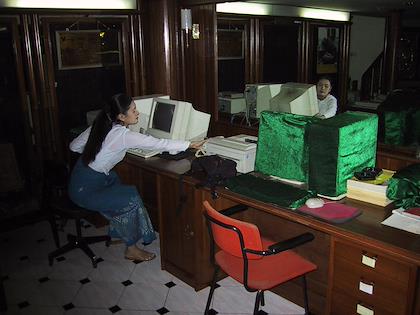 | A little roadside teashop. The chairs look tiny to western eyes, like they're meant for children, but everyone uses them, and just squats down really low. | | This is the computer setup at the Yoma Hotel, where I was able to send email. Notice the fitted green velvet computer covers. |