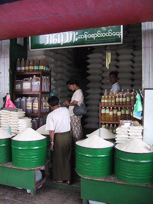 | Water, available on the street. People set up these water stations as a public service, to gain merit (in the Buddhist sense). | | A rice and oil shop |