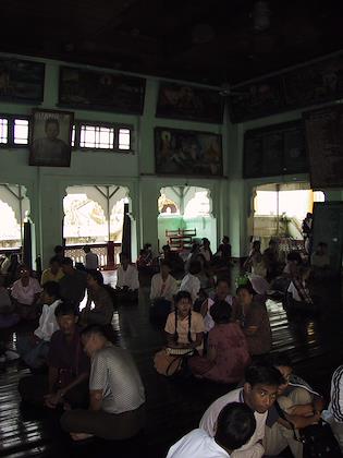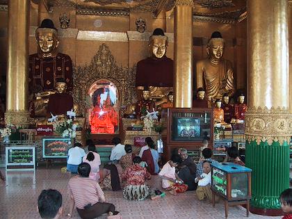 | Buddha statues at the Shwedagon Pagoda. The glass cases are for donations. | | People resting in Shwedagon. Notice the pictures close to the ceiling. They represent episodes in the life of Buddha. |