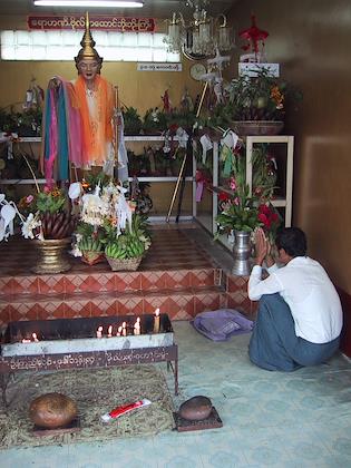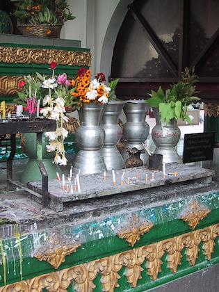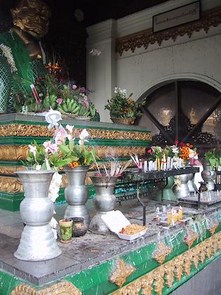 | Another nat shrine. Notice in the bottom right corner... | | ...there's cigarettes stuck in the tray. This spirit is very fond of cigarettes, apparently, so to please it, they light cigarettes and stick them there. |