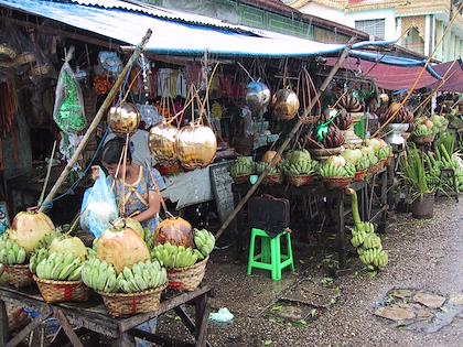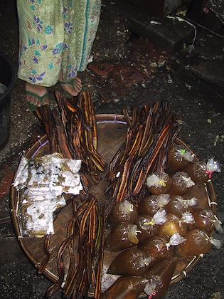| I have my fortune told for the first time by the fortune-teller that Tutu consults. | | A shop outside a temple, where you can buy gilded coconuts and bananas to give as offerings. |