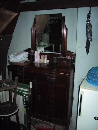 | This is the apartment of a friend of Tutu, my guide. The barrel of water in the back is for bathing--you stand in the concrete basin on the left, and pour water over you from the barrel. | | An old art deco style chest of drawers, probably worth lots. |